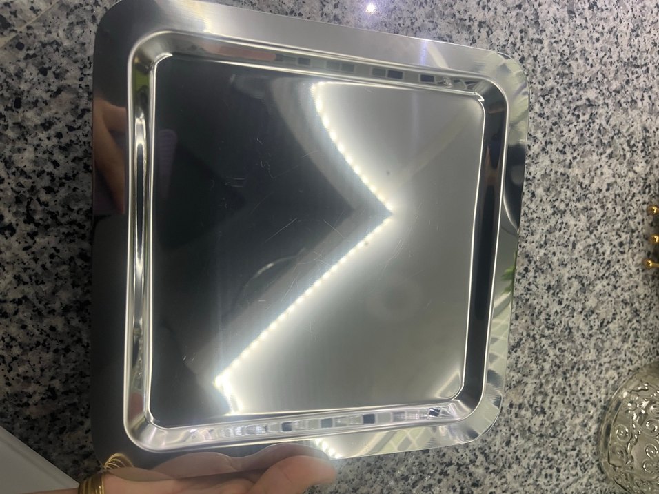 Parlak gri metal tepsi, düzgün kenarlarla. Mutfakta servis veya düzenleme için dayanıklı ve kolay temizlenir. ️