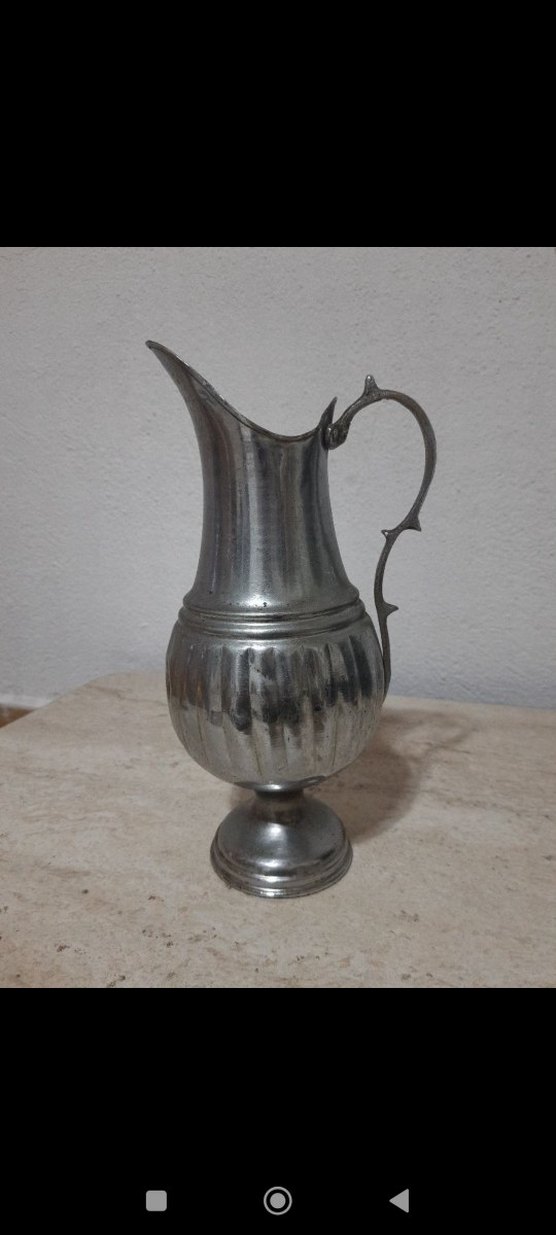 Parlak gri metalden yapılmış, kıvrımlı saplı ve yuvarlak tabanlı uzun şık vazo.
