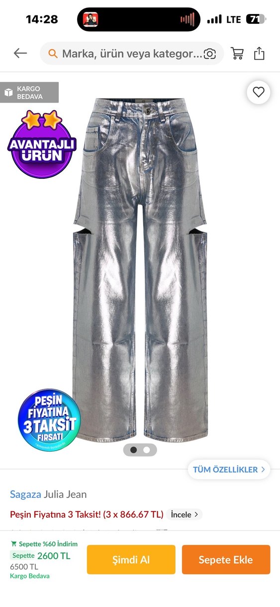 Gri metalik parlaklığa sahip,, bol kesim kadın jean. Sokak tarzı ve avangard bir görünüme sahiptir. ✨Sagaza
