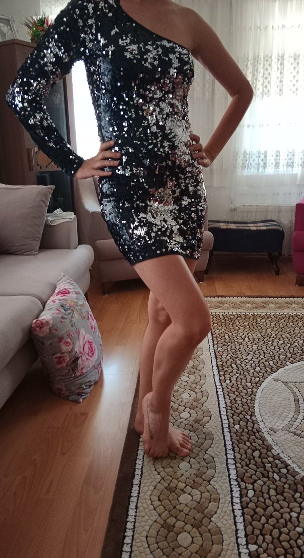 Parlak gri yılan desenli, sim detaylı, straplez ve dar kesim mini gece elbisesi. Parti için uygundur. ✨ koltuk altı yırtık var kolayca dikilebilir