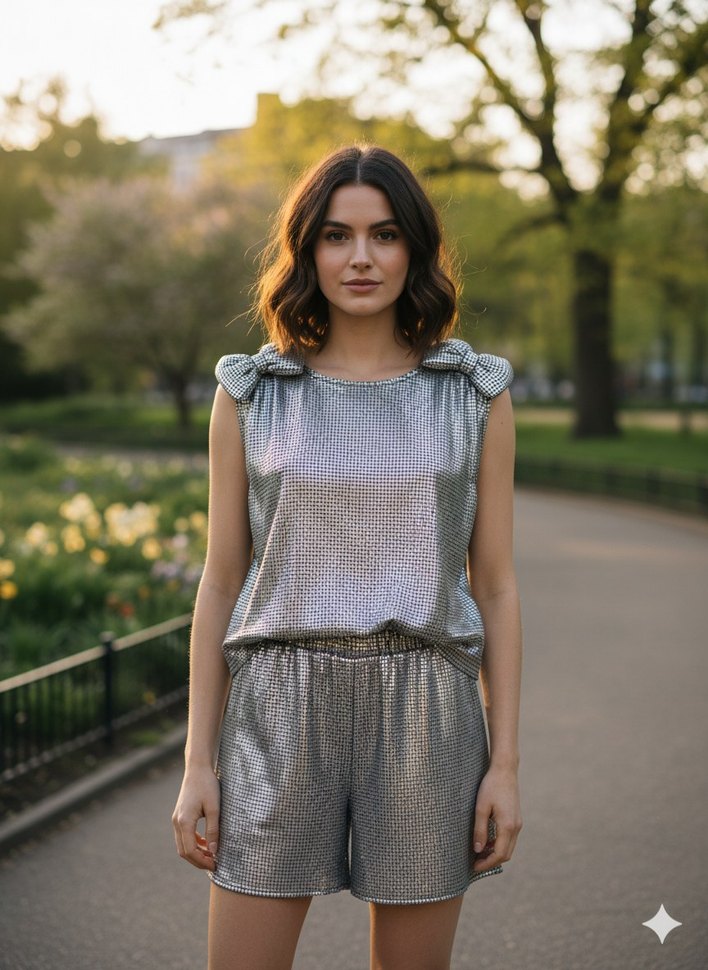 Parlak gri renkte, sentetik kumaştan yapılmış pilili ve bol kesim Atlet ve mini şort, avant-garde sokak modası ve parti kombinleri için uygundur. özel dikim etiketi yok atletin arka alt kısmında kısa çizgi mevcut çok beli olmuyor