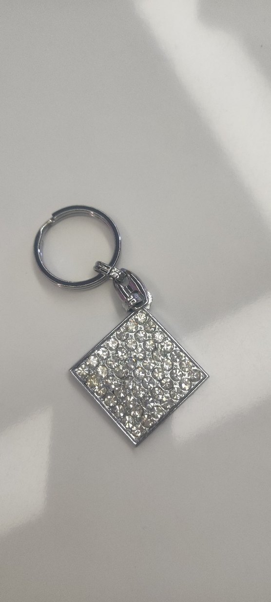 Parlak pullu gri kare kolye ucu ve metal halka içeren çağdaş, sade kadın anahtarlığı. Minimalist tarzda tasarlanmıştır.