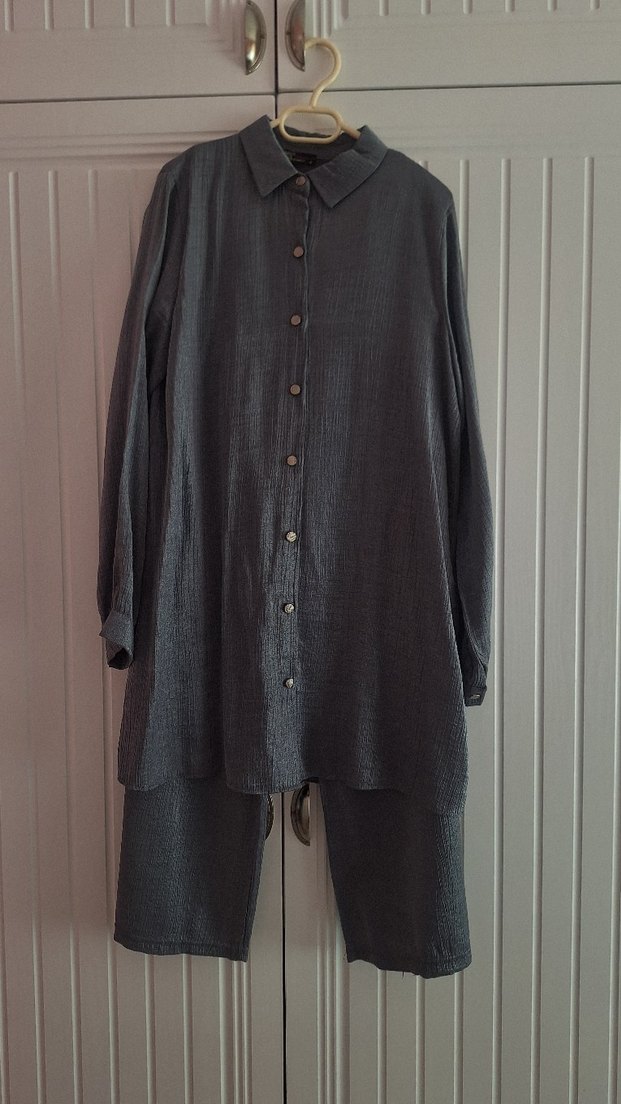parlak kumaştan, düğmeli ve uzun kollu, gri renkte takım.