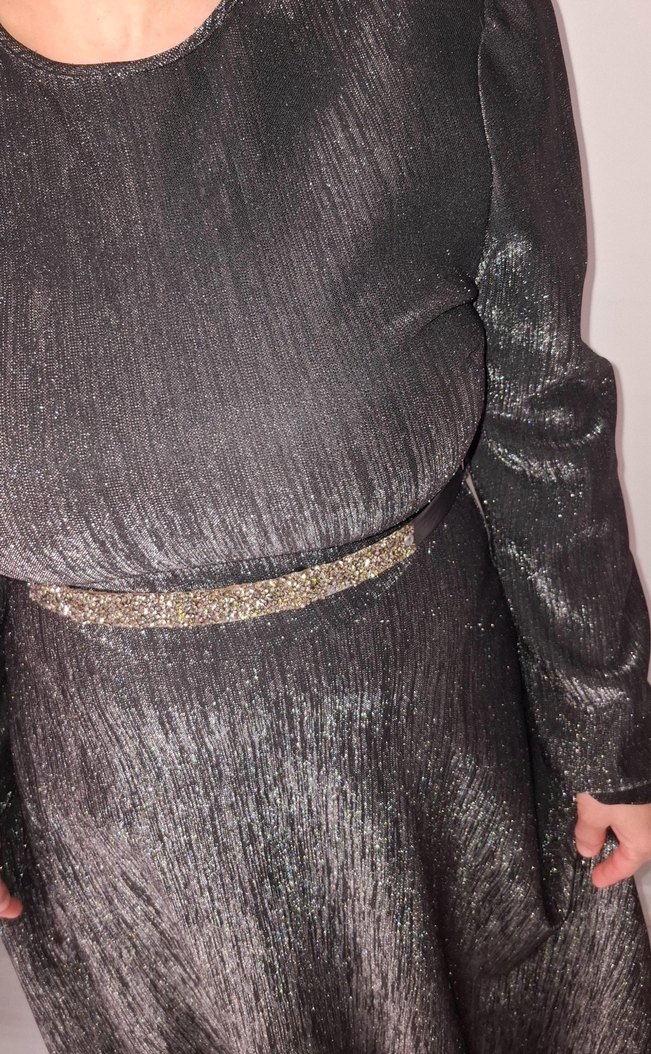 Parlak gri kumaştan, kemerli ve tekne yaka uzun, vücuda oturan abiye elbise. Askılı kol ve gotik tarzıyla parti için uygun. ✨ çok acil satam gerekiyor