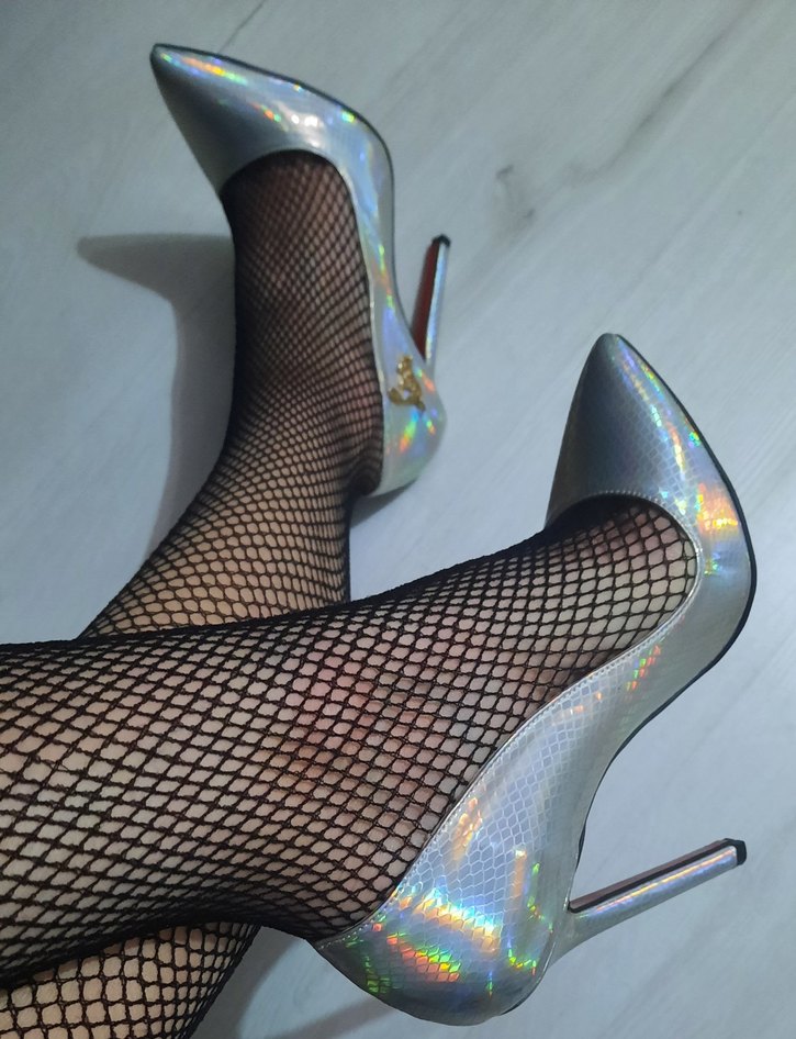 Parlak gri yılan desenli ve ışıltılı stiletto topuklu, sentetik kumaştan üretilmiş. Cesur parti görünümü için uygun. ✨