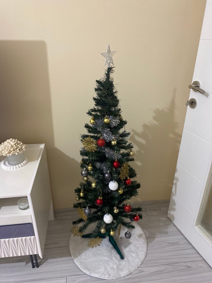 Parlak gri yılbaşı ağacı, kırmızı, altın, gümüş ve beyaz süslerle dekore edilmiştir. Üstünde yıldız ve beyaz bir ağaç süsleri ile birlikte