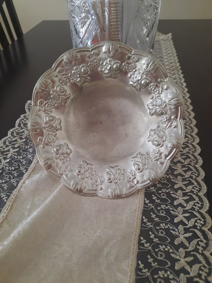 Kenarında çiçek kabartmalı detaylar bulunan parlak beyaz vintage tabak, gümüş görünümlü masada klasik bir dokunuş katar. ️