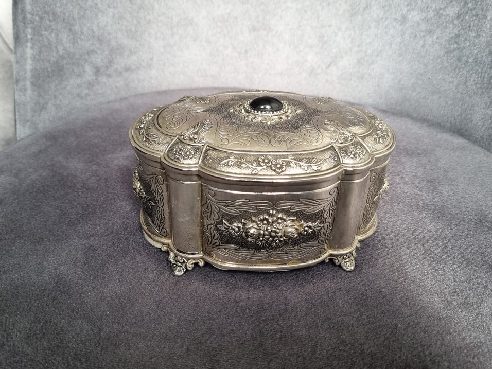Parlak gümüş renkli, çiçek desenli ve siyah taş detaylı vintage tarzda makyaj organizer kutusu. Küçük dekoratif ayaklar üzerinde durur.