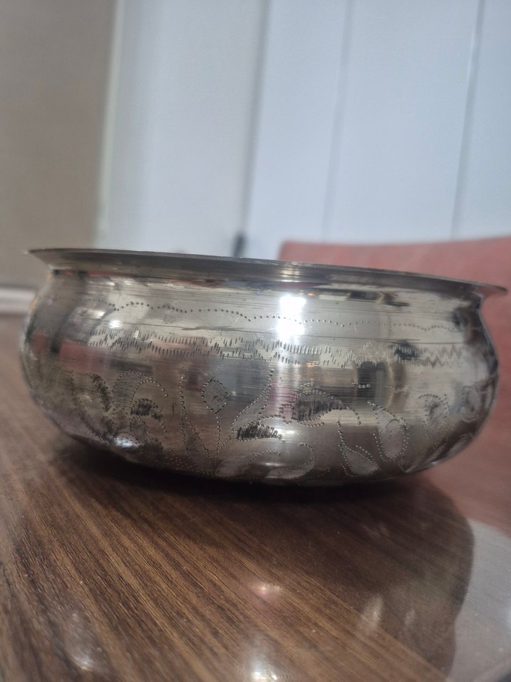Parlak gümüş renkli, işlemeli desenlere sahip geleneksel tarzda bir kase. Düz ve parlak yüzeyi ile dikkat çeker.
