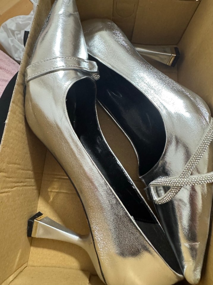 Parlak gümüş renkte, tokalı ve ince topuklu kadın abiye ayakkabıları, modern ve şık bir görünüm sunar. ✨
