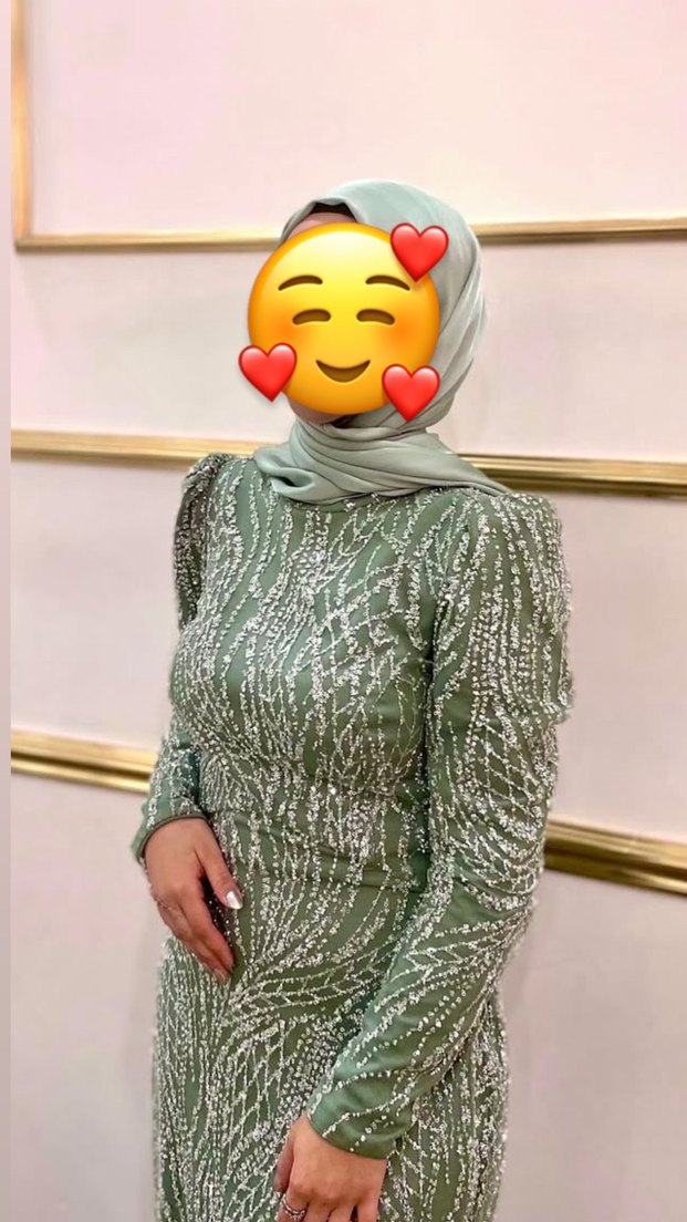 Parlak haki bağlama desenli, uzun kollu, yüksek yakalı ve drapeli modern kesim abiye elbise. ✨