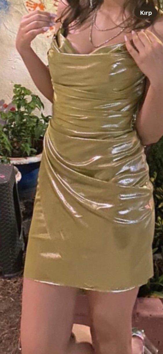 Parlak haki renkte, drapeli ve askılı kollu, straplez kesim midi elbise. Modern ve şık, gece partileri için ideal.
