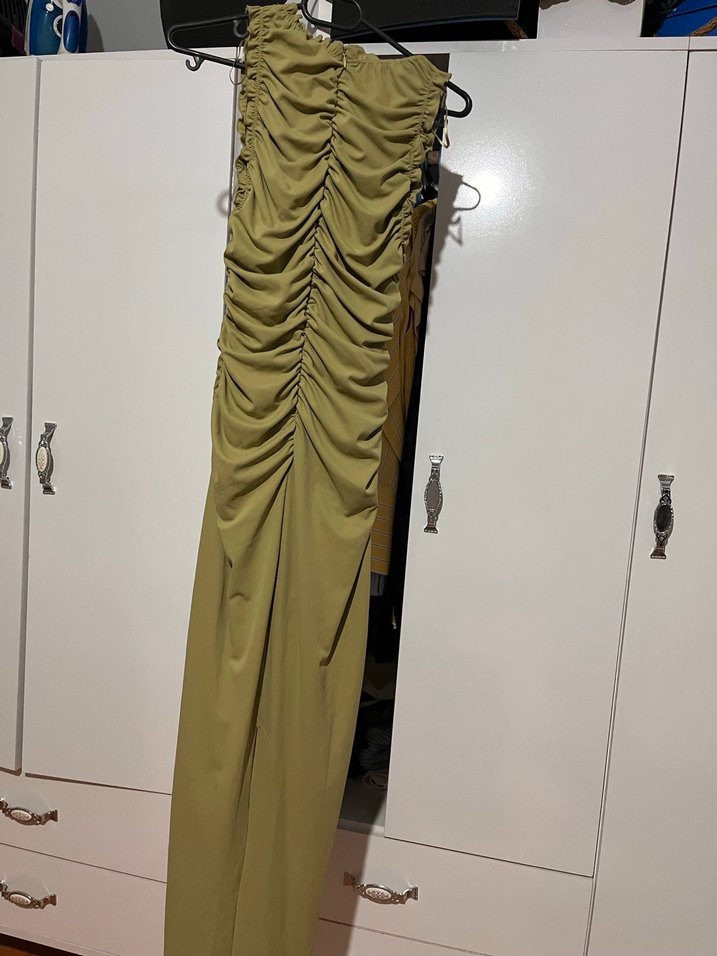 Parlak haki renkte, drapeli detaylara sahip, askılı ve uzun kesim, sentetik kumaştan modern bir kadın elbisesi.