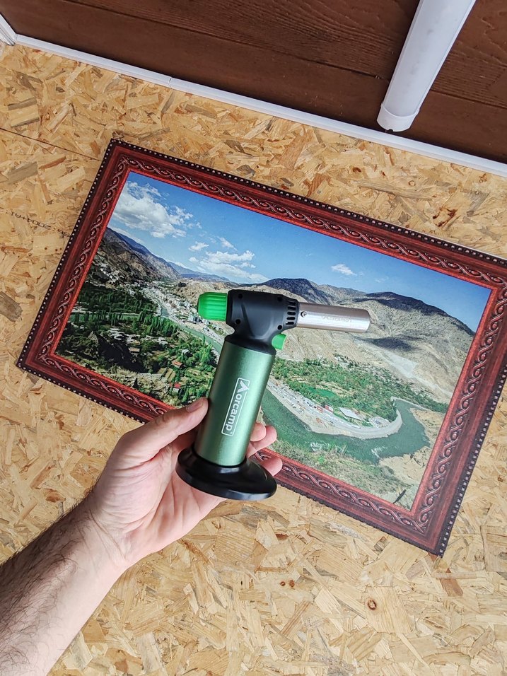 Parlak haki renkte, kompakt tasarımlı ve ayarlanabilir alev kontrolü olan el çakmağı.