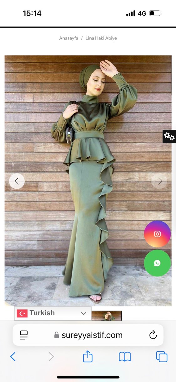 Parlak haki renkli, kamuflaj desenli, yüksek yakalı ve uzun kollu, drapeli uzun abiye elbise. Düğünler için düzenli kesim ve çok zarif ve şık