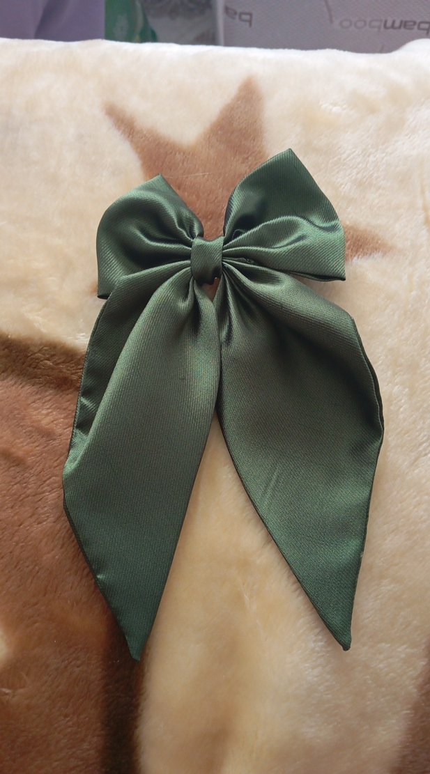 Parlak haki renkte, saten kumaştan yapılmış vintage bohem tarzında fiyonk saç aksesuarı. Saçlara yumuşak ve zarif bir dokunuş katar.