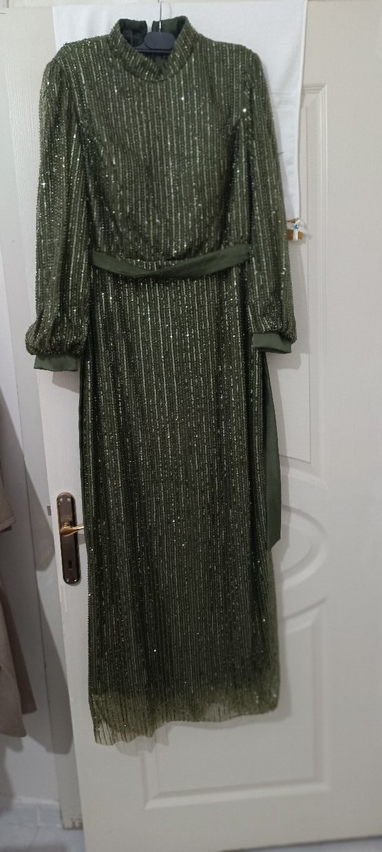 Parlak haki renkte, kemerli, tek renk uzun abiye elbise. Kayık yaka ve askılı kollarıyla klasik ve şık bir görünüm sunar. ✨