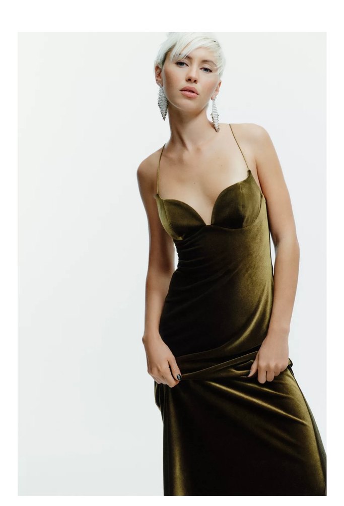Parlak haki rengi, V yaka ve drapeli tasarıma sahip, ince askılı uzun ve vücuda oturan saten kumaş elbisedir. Romantik akşamlar için uygundur.