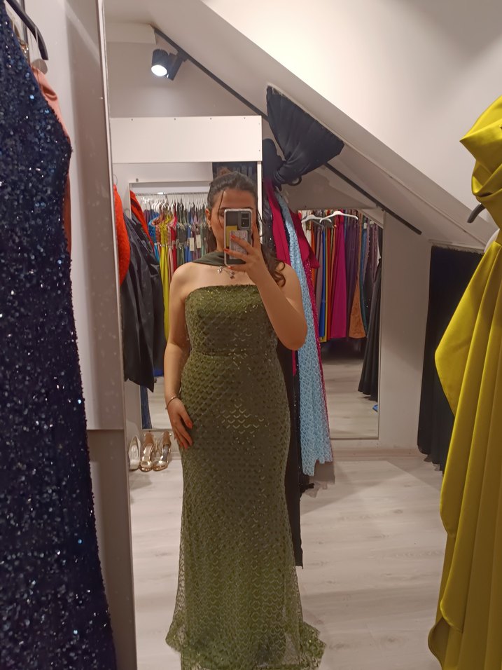 Parlak haki yılan desenli, straplez ve drapeli askılı, uzun ve vücuda oturan abiye elbisedir. Düğün ve özel günler için uygundur.