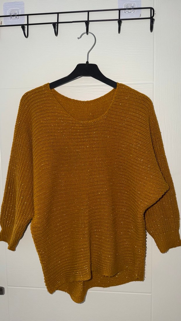 Parlak dokulu, uzun kollu, yuvarlak yaka, bol kesim hardal örgü kadın kazak. Rahat günlük kullanım için uygundur.