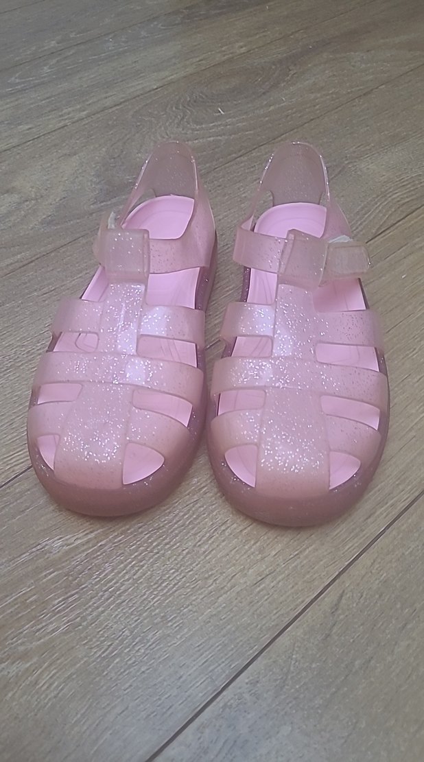 Parlak simli, pastel pembe renkte, kauçuk malzemeden yapılmış kız çocuk sandaletleri. Streetwear tarzına uygun.