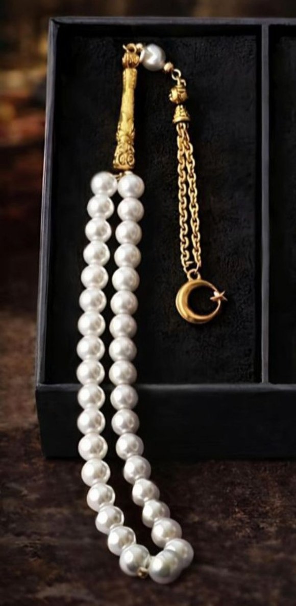Parlak beyaz inci boncuklardan oluşan erkek tesbih, geleneksel tasarım ve altın hilal aksesuarı ile sade ve şık bir görünüm sunar.