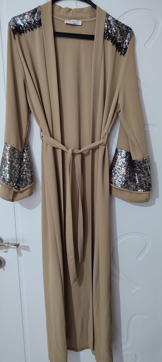 Bej renkli, bol kesim uzun elbise, parlak işlemeli kollar ve bel bağlama kemeri ile. Askılı kolları ve rahat sokak stili uyumu vardır. ✨