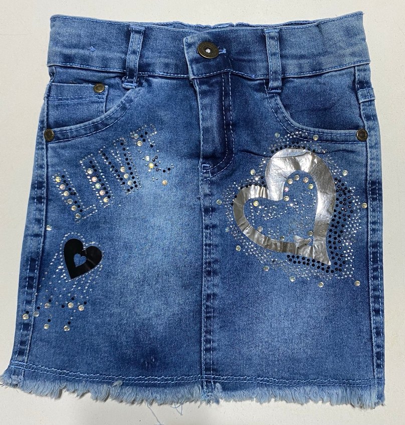 Bu fitted mavi denim etek, işlemeli desenler ve parlak payetlerle kızlar için trend rock punk tarzı sunar.