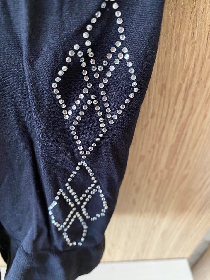 Parlak işlemeli geometrik nakışlı, koyu lacivert renkli, vücuda oturan taytı. Gotik ve avangart tarzda, günlük kullanıma uygun. ✨