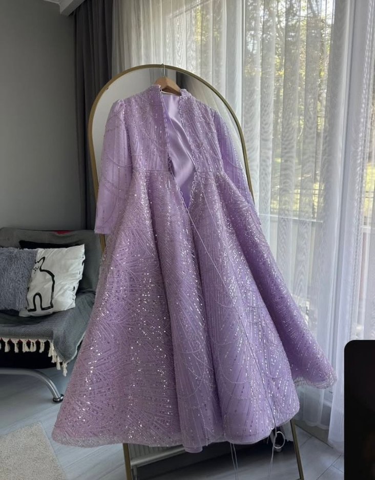 36-38-40 uyumlu Gün sorunuz Şal çanta dahil Parlak işlemeli desenlere sahip, drapeli uzun mor abiye elbise. V yaka, uzun kollu ve normal kesim, düğünler için uygun. ✨