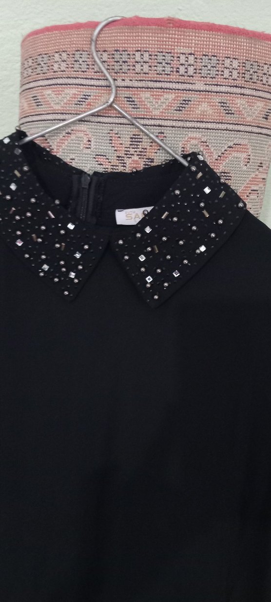 Dar kesim siyah minielbise, payet ve işleme detaylı yakaya sahiptir. Sentetik kumaştan yapılmış, gotik ve Paris tarzına uygun şık bir parçadır. ✨
