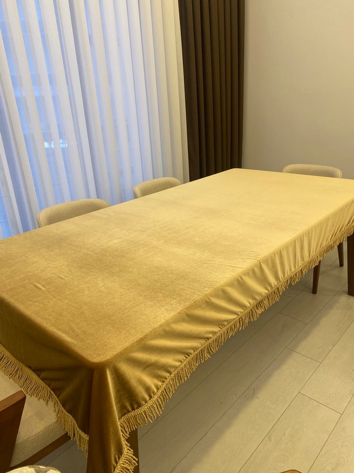 Parlak altın renkli, modern tarzda, desensiz ve püsküllü kenarlara sahip masa örtüsü. 140cm-260cm
