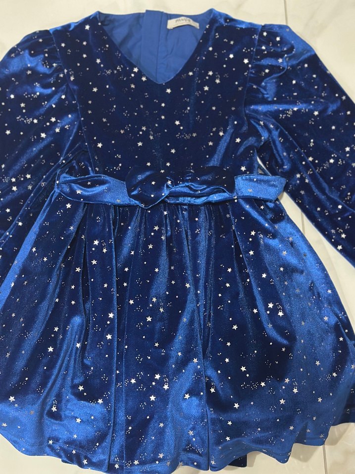 Parlak kadife kumaştan yapılmış, uzun kollu, V yaka ve fırfırlı detaylara sahip, yıldızlı desenli, kuşaklı, şık kesim kız çocuk elbisesi.