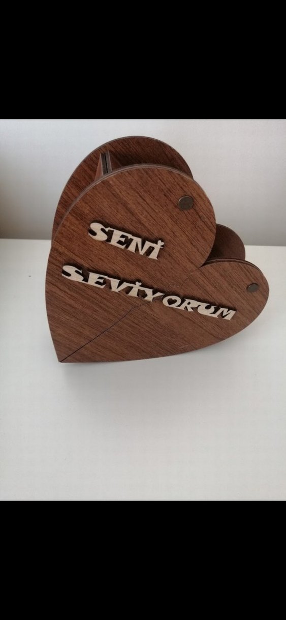 Parlak kahverengi ahşaptan kalp şeklinde, "Seni Seviyorum" yazılı kutu ❤️