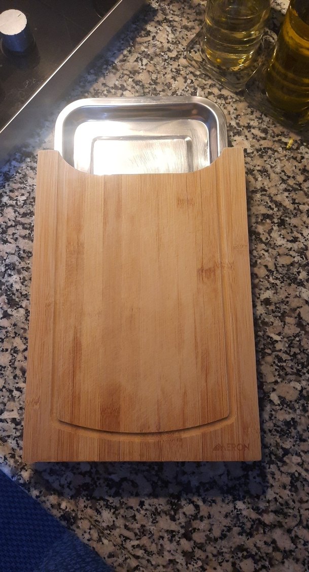 Parlak kahverengi ahşap kesme tahtası, çıkarılabilir metal tepsi ile yiyecek hazırlama ve servis için kullanışlıdır.