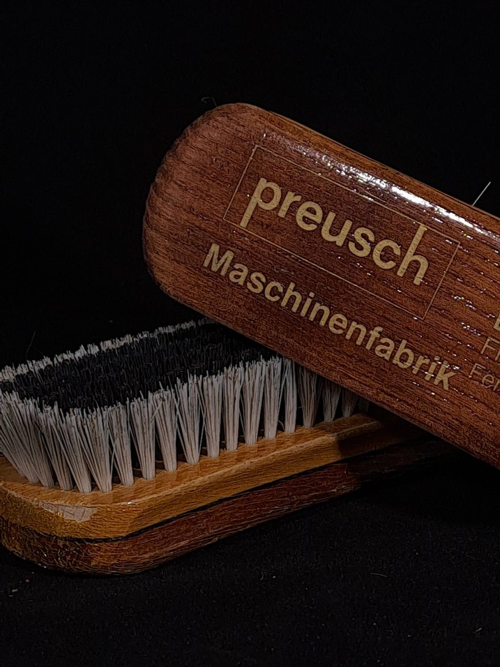 Parlak kahverengi ahşap saplı, "preusch Maschinenfabrik" yazılı kıyafet fırçası. Yumuşak kıllarla pürüzsüz uygulama sağlar.
