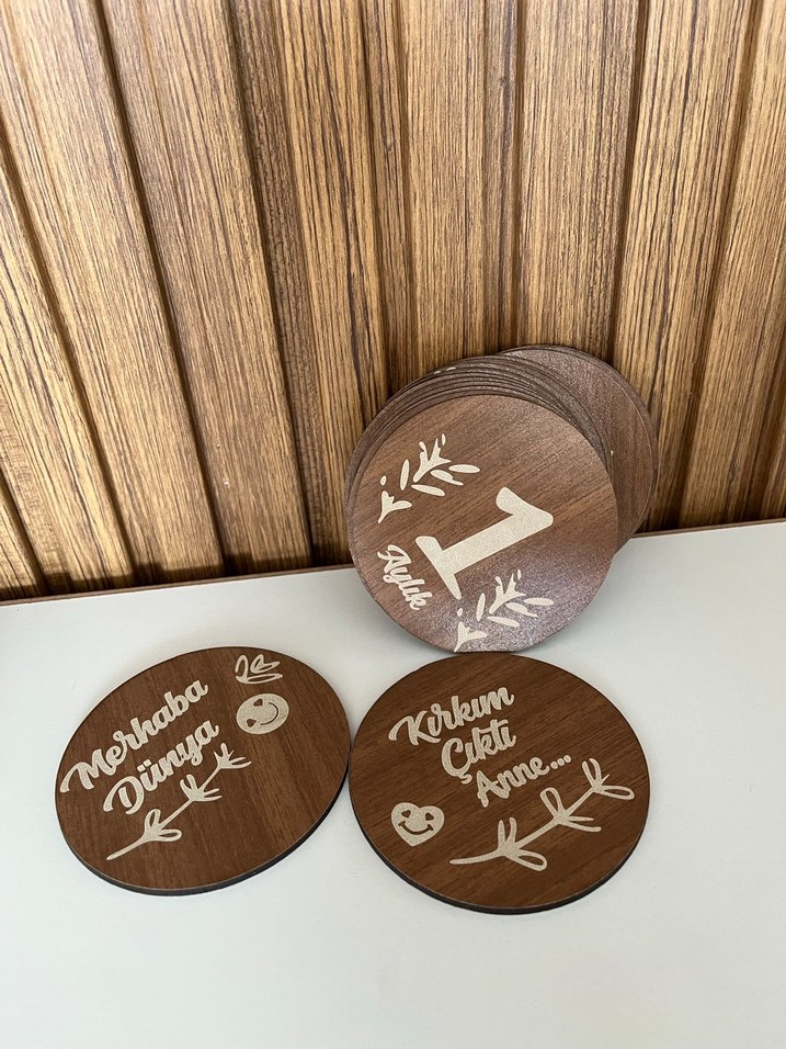 Parlak kahverengi ahşap oyuncak parçaları, üzerinde Türkçe yazılar ve doğal ahşap dokusu bulunur. "Merhaba Dünya" ve "Kırkım Çok Anne" yazılıdır.