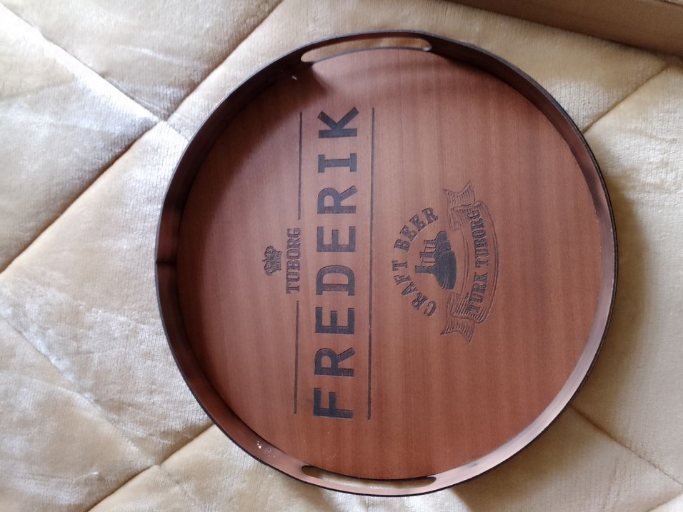 Parlak kahverengi ahşap mouse pad, 'Frederik' ve 'Craft Beer' yazılı, taşıma kulplu.