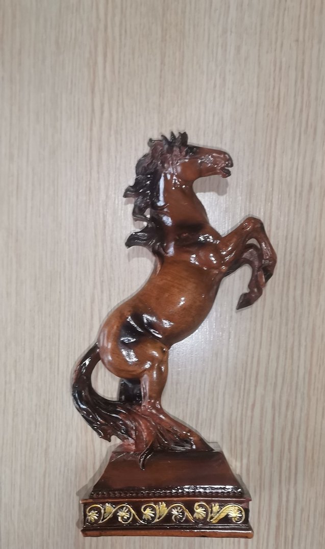 Parlak kahverengi renkte, kuyruk ve yelesi detaylı, arka ayakları üzerinde duran at figürü.