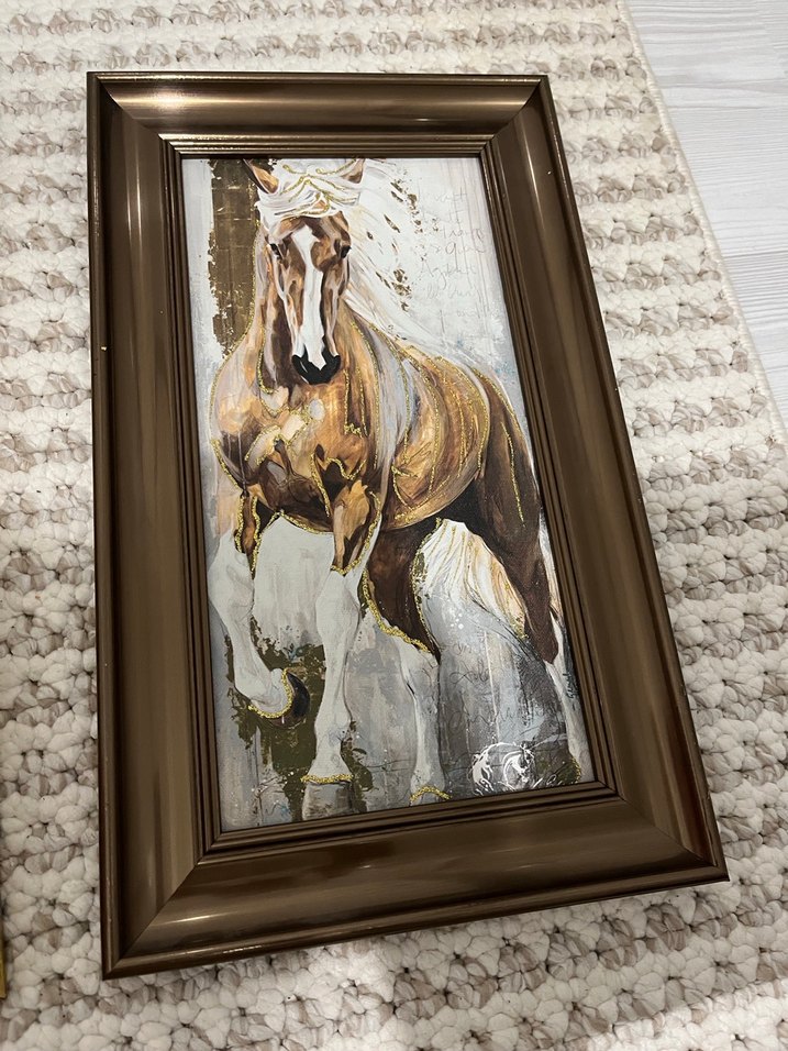 Parlak kahverengi tonlarında at figürlü tablo, kahverengi çerçeve ile tamamlanmıştır.