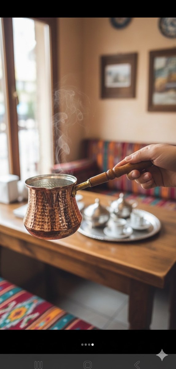 Parlak kahverengi bakır cezve, ahşap saplı, geleneksel kahve demlemek için uygun. ☕