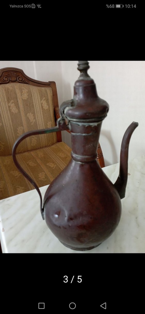 kahverengi bakır, kıvrık ağızlı ibrik göründüğü gibidir. Boy 34 cm en 23 cm