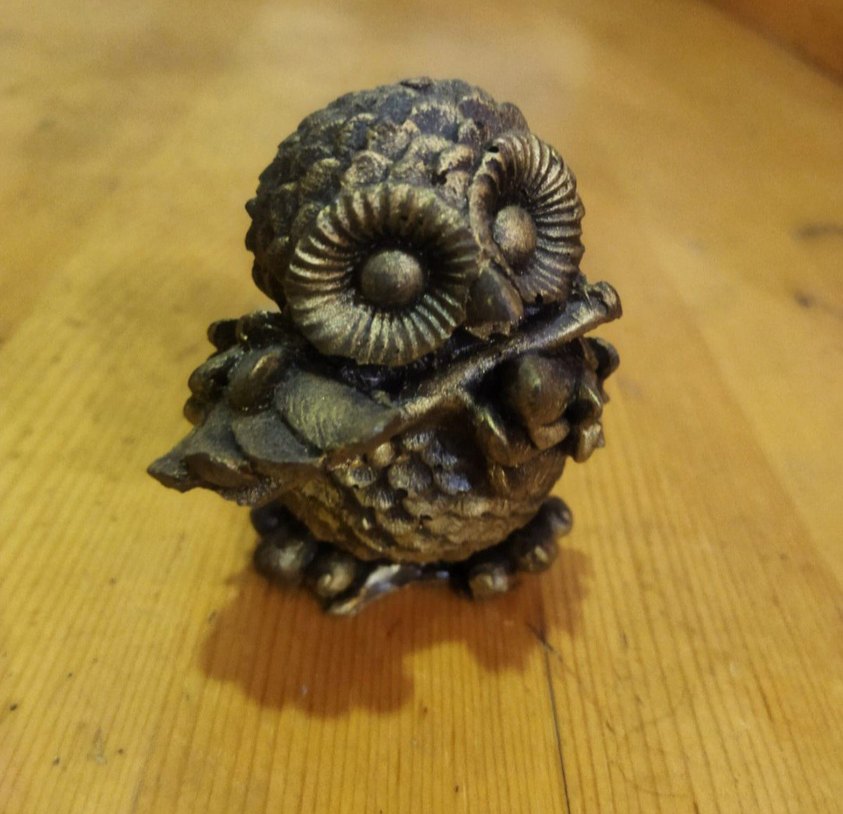 Detaylı tüyleri ve büyük gözleri olan parlak kahverengi baykuş biblosu, küçük bir dal tutuyor. Dokulu yüzeye ve parlak bir görünüme sahip.