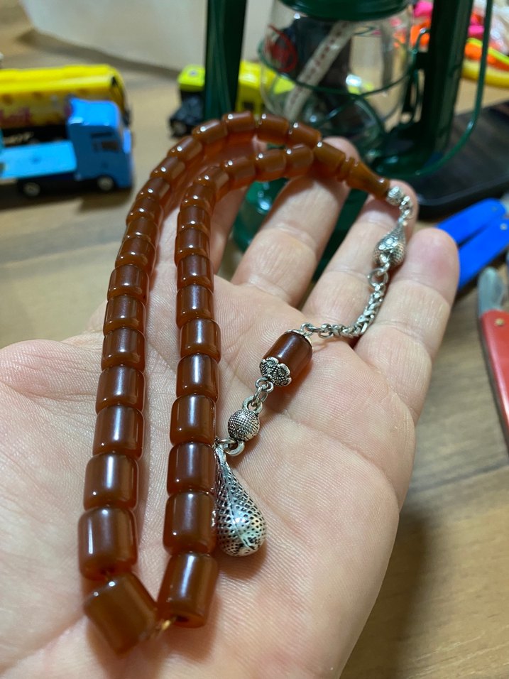 Parlak kahverengi boncuklardan oluşan, gümüş detaylı bohem tarzı erkek tesbih. Boncuklar düzgün şekilli ve gümüş zincirle süslenmiştir.
