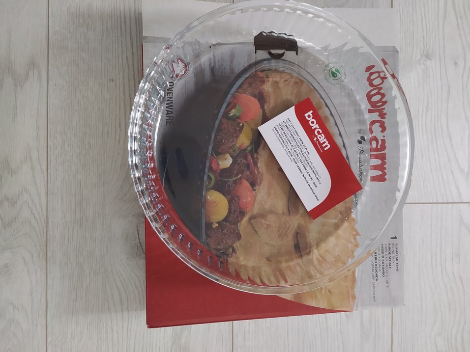 Parlak kahverengi Borcam cam fırın kabı, şeffaf kapaklıdır. Dayanıklı ve ısıya dayanıklıdır.