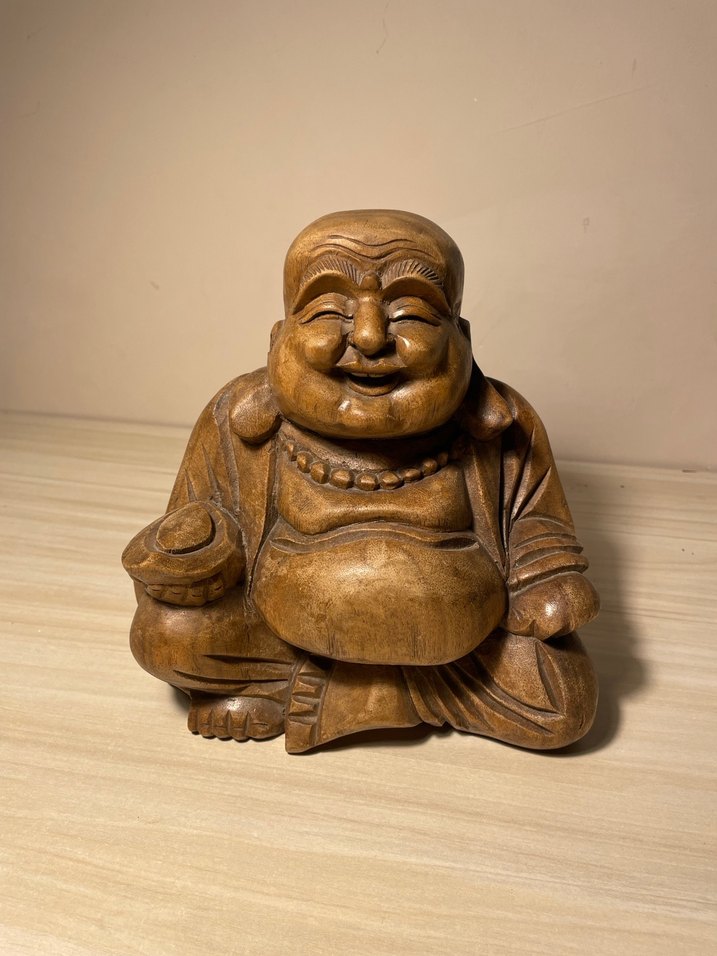 Parlak kahverengi renkte, oturur pozisyonda gülümseyen Buda biblosu. Elinde küçük bir obje tutuyor, detaylı ve parlak yüzeye sahip. ♂️