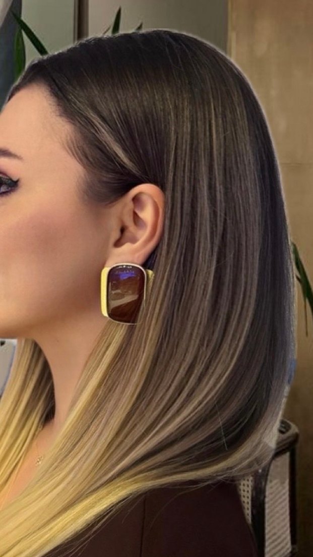 Kahverengi gold renkli küpeler, cesur ve çağdaş bir görünüm için romantik akşamlarınızda öne çıkar.