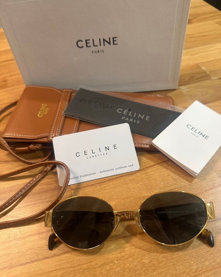 Celine Paris imzalı parlak kahverengi güneş gözlüğü, klasik ve karşı kültür tarzını yansıtıyor. Deri kılıf ve orijinallik kartlarıyla birlikte gelir.
