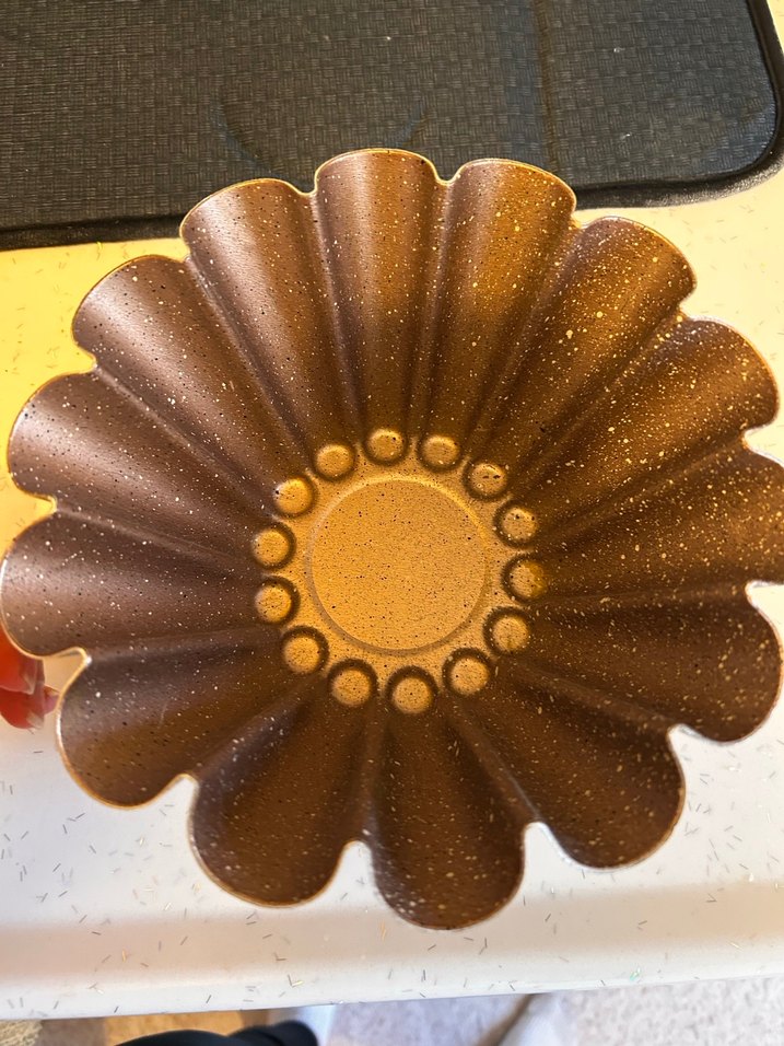 Parlak kahverengi, çiçek şeklinde ve pürüzsüz yüzeyli kek kalıbı, dekoratif kekler için uygundur.