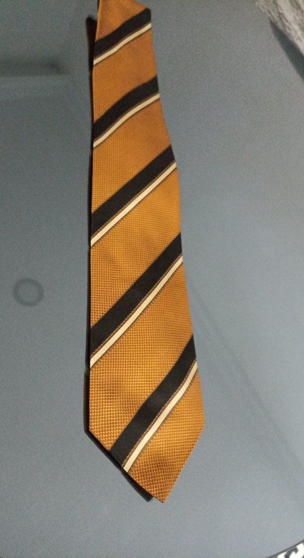 Erkek kravatı, parlak kahverengi kumaş ve belirgin siyah-beyaz çapraz çizgilerle dikkat çeken nostaljik bir tasarıma sahiptir.marka temsilidir